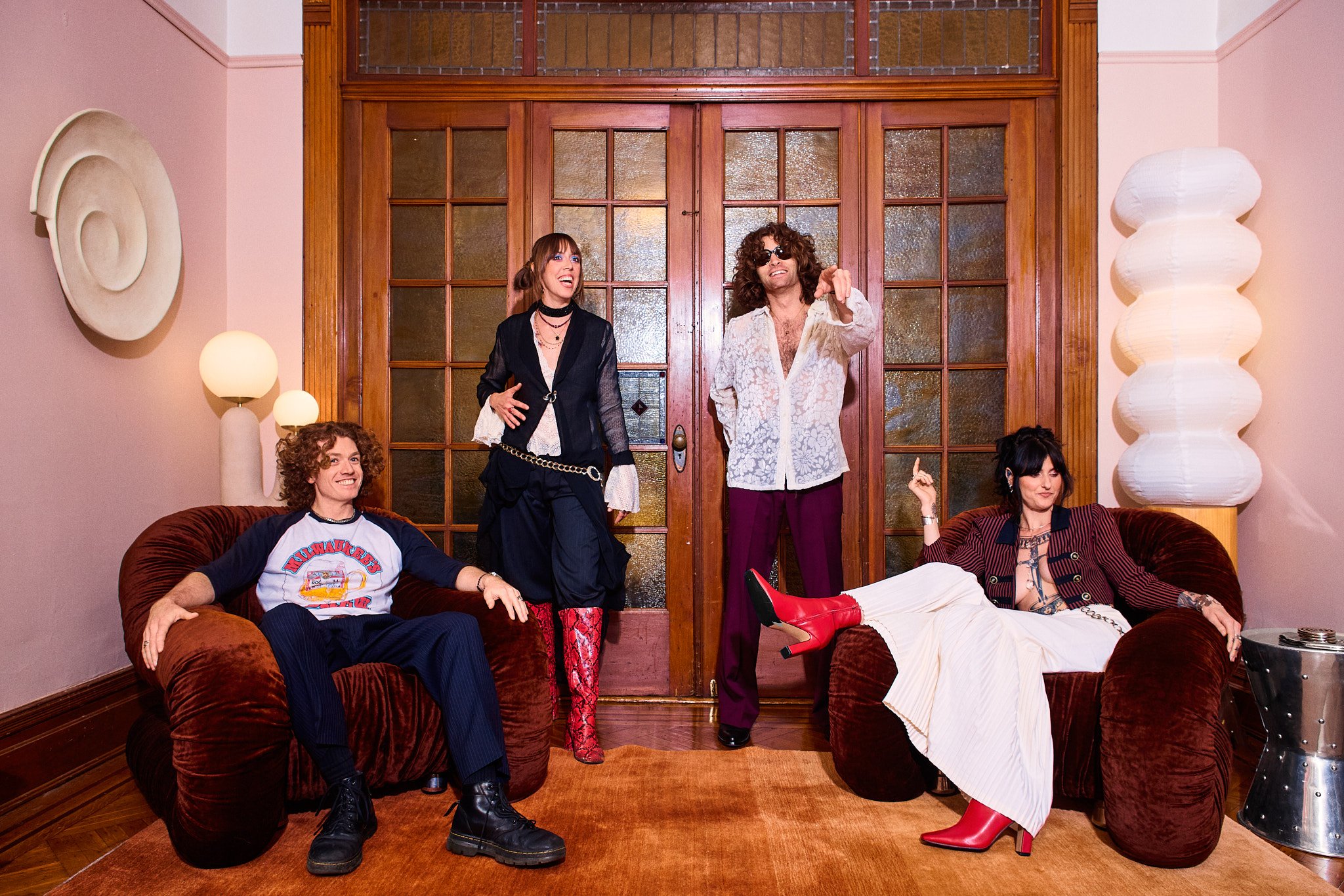Don’t let their smoky mystique and rock demeanor intimidate you; these talents are simply a delight to work with. Having seen them several times, the band started to recognize me, and eventually it snowballed into my sheepishly asking if they’d let me and my close stylist collaborator, Madisson Yarnell, put together a photoshoot for them. The band, curious and obliging, braved an early call time and a full day shoot the day after a show to work with my team. The impeccably tattooed Alli, while stoney and fearsome on stage, has a sunny smile and makes chic jewelry, sporting her own pieces for our shoot. Emma, more than overjoyed to play our breakfast chef, performed a theatrical balancing act as she fried an egg, held her bass, and climbed the kitchen counters. Max, a real-life therapist, gave shiny eyes and dimples as he told me that when he’s playing on stage, he simply feels happy. Char had us all in giggles while performing a silent solo; blow-drying his voluminous locks, both guitar and hair dryer unplugged.